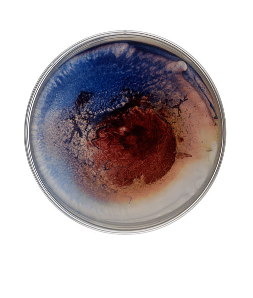 Towards the end of my 3rd year at the National College of Art and Design, displeased with the direction of my work, I became concerned with process. I approached Trinity College and arranged a series of visits to the Genetics labs to research processes. I simplified and recreated these processes, replacing the solutions used in DNA testing with common painting liquids. Using these paint liquids to solidify pigments, I conducted a large number of experiments in Petri dishes. These experiments were exhibited at my degree show in 2001. They were presented in the form of large digital prints heat mounted onto clear perspex.
